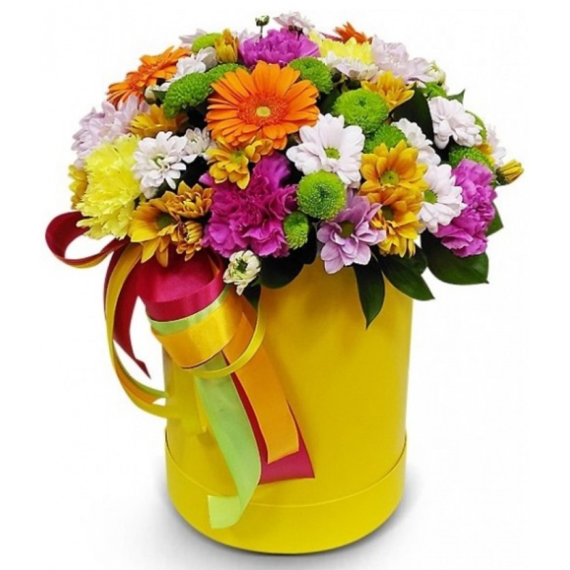Букет состоит из 7 гвоздик, 3 гербера, 5 хризантем Сантини, 7 хризантема кустовая, рускус, коробка, оазис, атласная лента.