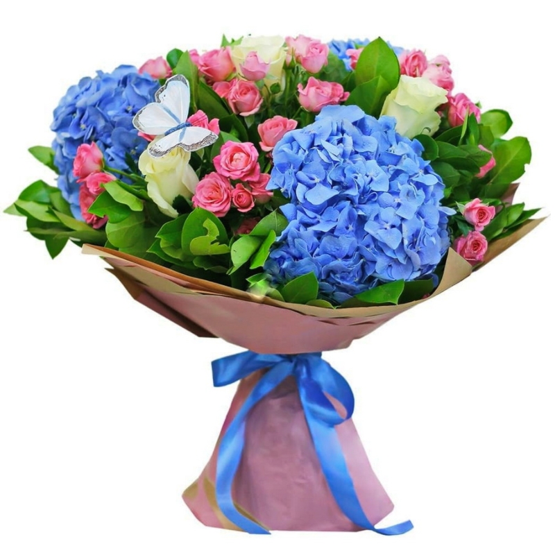 Букет состоит из 3 гортензии, 3 розы, 7 веток кустовых роз, зелень, крафт, атласная лента.