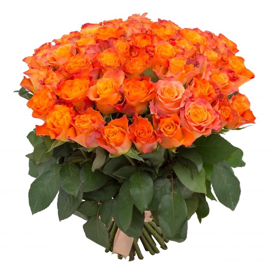 Букет состоит из 55 оранжевых роз, прозрачная упаковка, атласная лента.