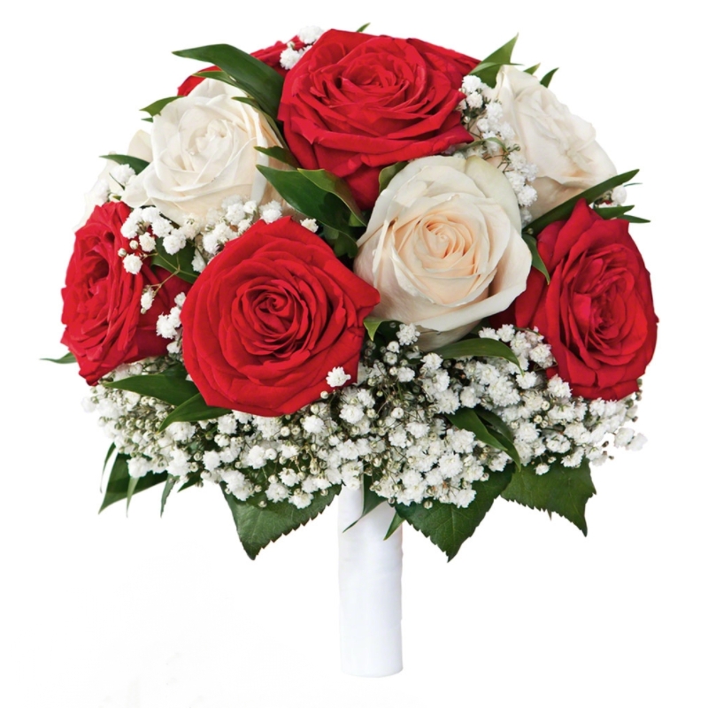 Букет состоит из 7 красных роз, 6 белых роз, 4 гипсофила, зелень, лента.