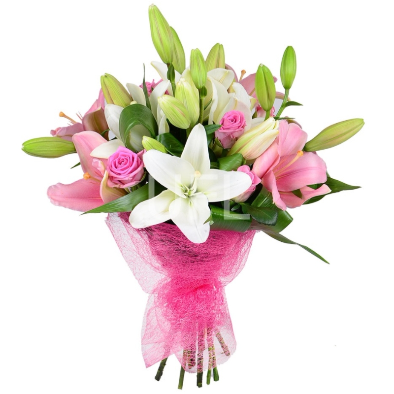 Букет состоит из 7 розовых роз, 3 белые лилии, 3 розовые лилии, аспидистра, красивая упаковка, атласная лента.