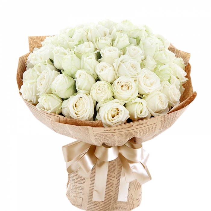 Букет состоит из 55 белых роз, крафт, атласная лента.