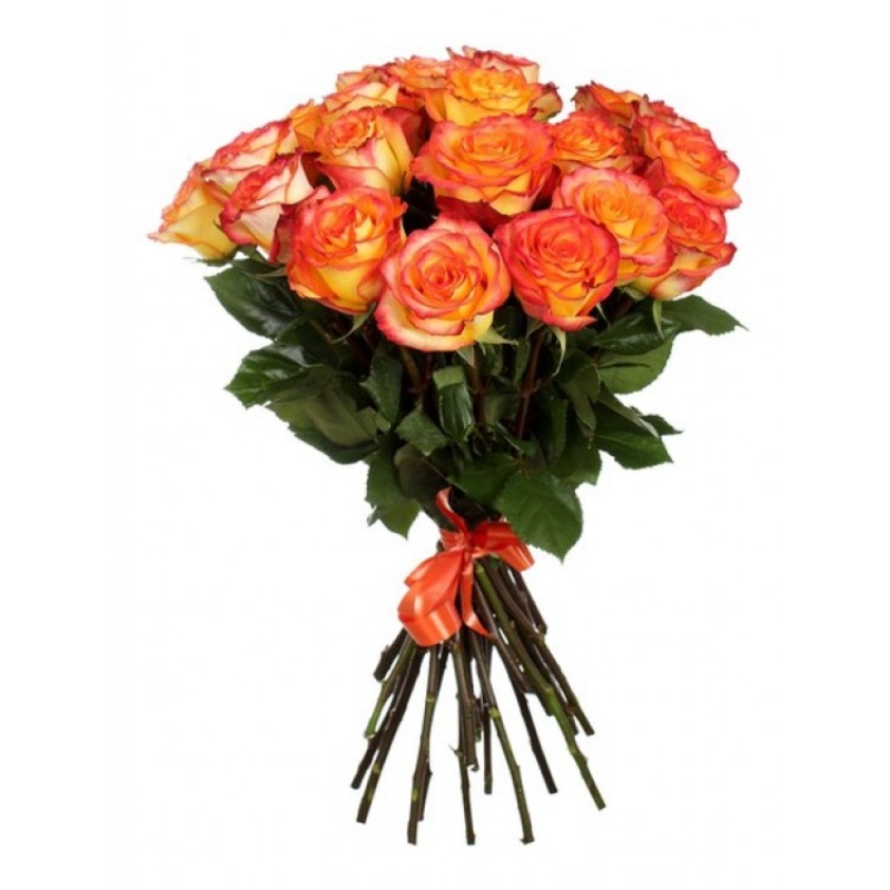 Букет состоит из 19 оранжевых роз, прозрачная упаковка, атласная лента.